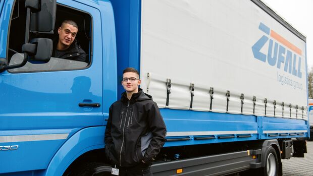 Die konsequente Fahrerausbildung ist vor allem eine Stärke des Mittelstandes, weil sie dazu schlicht die besseren Möglichkeiten haben. Auch bei der Zufall Logistics Group in Fulda werden derzeit drei junge Leute ausgebildet, wie Mohamed Anous-El Aloui (im Lkw) im zweiten Lehrjahr und Nico Schreiber im ersten Lehrjahr. „Die ZUFALL logistics group begegnet dem Mangel an qualifizierten Berufskraftfahrern auch dadurch, dass wir seit gut zwei Jahren selbst wieder in diesem Bereich ausbilden“, heißt es schriftlich aus Fulda. „Ziel des Unternehmens ist, diese Fahrer auch über ihre Ausbildung hinaus an ZUFALL zu binden: durch ein lukratives Beschäftigungsmodell, flexible Arbeitszeiten und moderne Fahrzeuge. ZUFALL möchte so Anreize für einen Beruf schaffen, in dem die Mitarbeiter eine sehr hohe Verantwortung tragen und mit zu den Aushängeschildern eines Unternehmens gehören.“