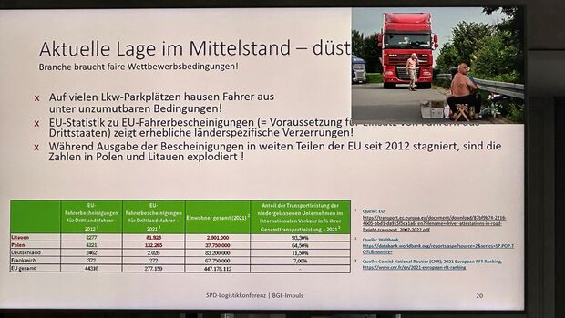 Doch in Deutschland verzögert das FDP-geführte Bundesverkehrsministerium weiterhin die Umsetzung des EU-Mobilitätspaketes. Die Novelle von Fahrpersonalgesetz (FPersG) und Fahrpersonalverordnung (FPersV), die auf verbindliche Vorgaben anstelle von Bußgeld-Empfehlungskatalogen setzt, soll immerhin im Herbst als Referentenentwurf vorliegen. „Ob sich die Bußgelder so erhöhen, dass sie im Sinne der SPD-Fraktion Wirkung zeigen, bleibt abzuwarten“, berichtete im Vorfeld der Konferenz bereits der Background Verkehr & Smart Mobility des Berliner Tagesspiegel.