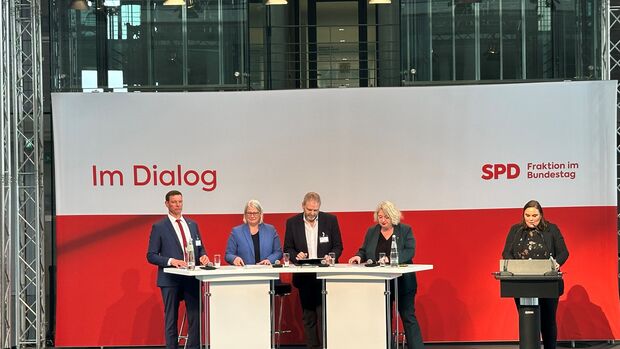 Es waren rund 180, in ihren unterschiedlichen beruflichen Funktionen von Gewerkschaftsvertretern über Lkw-Fahrer bis Verbandslobbyisten höchst engagierte Menschen, die am 22. April nach Berlin ins Paul-Löbe-Haus strömten. In dem Gebäude neben dem Reichstag tagen unter anderem die Ausschüsse. So wie der Verkehrssauschuss, den der SPD-Politiker Udo Schiefner nach Beginn der Ampelkoalition aus SPD, FDP sowie Bündnis 90/Die Grünen als Vorsitzender übernommen hat. Mit der verkehrspolitischen Sprecherin der SPD-Bundestagsfraktion, Isabel Cademartori, leitete Schiefner nach den ersten vier Impulsvorträgen die sechs Workshops in zwei Runden. Denn unter dem Motto „Liefern!“ suchte die AG-Verkehr der SPD-Bundestagfraktion auf ihrer Logistikkonferenz gemeinsam mit den Gästen Lösungen, um die Arbeitsbedingungen etwa der Lkw-Fahrer zu verbessern, den Ausbau der maroden Infrastruktur zu garantieren und die lange und noch sehr dornenreiche Transformation zum klimaneutralen Verkehr zu gestalten.