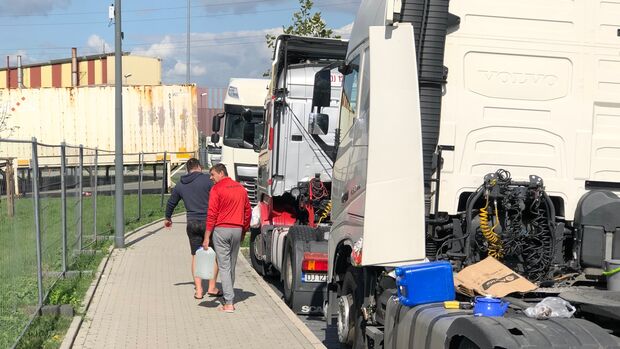 Am Wochenende stehen dort auf den Parkstreifen bis zu 50 Lastzüge aus Osteuropa. Einen Autohof für die Lkw-Fahrer gibt es hier nicht. Den hatte offenbar, wie im Logport von Duisburg niemand auf dem Schirm. Ganz so drastisch sind die Zustände hier nicht. Alles ist schön sauber. Gegen Mittag kommen die Fahrer aus den Kabinen der geparkten Lkw. Die meisten Zugmaschinen haben litauische, lettische oder rumänische Kennzeichen. Die Fahrer kommen aus Georgien, Kirgisistan, der Ukraine, aus Rumänien, aus Weißrussland. Sie holen Wasser in Kanistern und fangen an, rund um ihre Lkw zu kochen. In Vorbereitung der Sendung von FERNFAHRER live (siehe Terminhinweis weiter unten) haben meine Frau Christina Petters und ich mit einigen von ihnen gesprochen. Jedes Gespräch, auf Englisch und zum Teil mit einem Übersetzungsprogramm vornehmlich ins Russische, ein Treffer. Sauber ist hier streng genommen nichts.