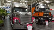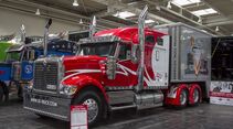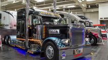 Am Stand von American Truck Promotion sorgen zehn komplette Lastzüge der Marken Peterbilt, International Freightliner und Volvo USA für Gänsehautfeeling. Frei von europäischen Gesamtlängenbegrenzungen verwöhnen die US-Hauber ihre Fahrer nicht nur mit einem komplett anderen Fahrgefühl, sondern bieten mit den in der Regel sehr großzügigen Kabinen – Sleeper genannt – eine Menge Lebensraum für den Trucker. "Auch in Europa ist es möglich, sich diesen Traum zu erfüllen", sagt Marco Barkanowitz. Außer zu reinen Showzwecken zählt er gleich mehrere Anwendungen auf, die seine Kunden mit den US-Trucks hierzulande bewältigen. Darunter Kippsatteleinsätze, Baustofftransporte mit Ladekran oder auch Silozüge.