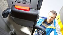 Relativ neu im XF105 - Modellpflege muss schließlich auch im Alter sein - sind einige Sicherheitsausrüstungen wie adaptiver Tempomat (ACC) oder Spurhalteassistent, die aber, wie in der Branche üblich, extra bezahlt werden müssen. Im Fall DAF arbeitet ACC mit der üblichen maximalen Verzögerung von 2,5 m/s², was durchaus einer kräftigen Bremsung entspricht. Aktiviert ACC die Bremsfunktionen, dann setzt zuerst die Motorbremse ein, es folgen der Retarder und schließlich die Betriebsbremsen. Folglich lässt sich ACC nur ordern, wenn gleichfalls ein Retarder bestellt wird. Zum Thema Sicherheit zählt auch die Türverriegelung Night Lock. Dahinter verbergen sich zwei verschiebbare Bolzen, mit denen sich die Türen von innen zusätzlich verriegeln lassen und die es bisher nur bei DAF gibt.