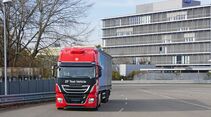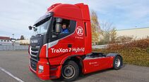 Hier kommt der eingangs erwähnte Erprobungsträger ins Spiel. Wie es die seitliche Beschriftung der Stralis-Kabine verrät, geht es um das in diesem Lkw zu Testzwecken verbaute „TraXon 2 Hybrid“ – ein Getriebe, das auf der IAA Transportation im September 2024 vorgestellt worden war, und das Diesel- sowie Elektromotor in nur einem Antriebsstrang vereint. Aber auch die Kombination von CNG/LNG-Motor oder Wasserstoffverbrenner und Traxon 2 Hybrid ist möglich.
