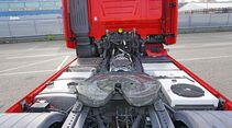 Hinter dem Fahrerhaus erwartet uns ein ungewohntes Bild: Links am Rahmen hängen Abgasbox, Messtechnik und ein Dieseltank, rechts am Rahmen eine Elektronikbox mit Wechselrichter sowie ein Batteriepaket. Mittig verläuft der ebenso ungewöhnliche wie innovative Strang aus Dieselmotor, Kupplung, E-Motor, Traxon 2, Intarder und schließlich Kardanwelle.