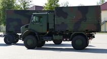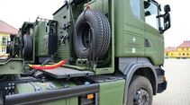 Allerdings wird man auch den Bw-Fuhrpark-Lkw ihren Charakter weiterhin anmerken. Die Umrüstung der Serienzugmaschinen auf hümS-Standard war keine Kleinigkeit: Die olivgrün lackierten Lkw erhielten links hinter der Kabine eine Staubox aus Aluminium. An ihrer Rückseite sind Halterungen für Zubehör wie Wasserkanister, Feuerwehrlöscher und Tarnstangen angebracht. Die Box ist zusammen mit einem Reserveradheber und einer Reserveradhalterung auf einem robusten Komponententräger hinter dem Fahrerhaus installiert. Eine weitere Besonderheit ist die Sattelkupplung: Sattelplatte und Aufsattelhöhe sind variabel einstellbar, was die Kombination des Zugfahrzeugs mit unterschiedlichen Aufliegertypen ermöglicht.