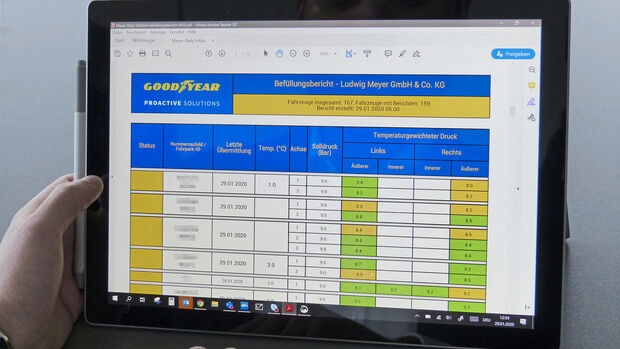 Damit solche Kosten gar nicht erst entstehen, setzt Steyer auf die App von Goodyear Proactive Solutions. Diese versorgt den Fuhrparkleiter direkt mit Push-Nachrichten, sobald ein Fahrzeug der Flotte einen schleichenden Luftdruckverlust hat oder die Temperatur des Reifens zu hoch ist. „Zudem erhalten wir täglich um sechs Uhr morgens ein E-Mail-Reporting über den aktuellen Reifen-Status-Quo der Flotte, das anschaulich darstellt, welche Fahrzeuge wir im Blick halten müssen“, berichtet Steyer aus der Praxis. „In der Tat hatten wir sogar auch schon einige Fälle, in denen uns Goodyear Proactive Solutions rechtzeitig vor einem möglichen Ausfall gewarnt hat“, erinnert sich Steyer. In einem speziellen Fall konnte sogar eine defekte Felge identifiziert werden, ein Schaden, der selbst bei ordnungsgemäßer Abfahrtskontrolle durch den Fahrer nicht zu identifizieren ist.