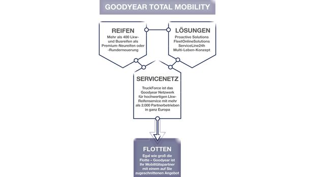 Mit „Goodyear Total Mobility“ bietet der Reifenhersteller seinen Nfz-Flottenkunden ein Mobilitätskonzept, das hilft, die Gesamtbetriebskosten eines Fuhrparks zu senken. Es besteht aus drei Modulen: das Vollsortiment an Nutzfahrzeugreifen, Lösungen für das Reifen- und Flottenmanagement sowie das Goodyear-Servicenetzwerk.