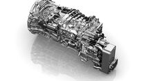 Keine zehn Jahre später: AS Tronic heißt das neue große Getriebe für schwere Lkw. Die Basis bildet ein klauengeschaltetes Dreiganggetriebe mit synchronisierter Vor- und Nachschaltgruppe. Erstmals kommen zwei Vorgelegewellen zum Einsatz, damit sich die anfallenden Kräfte besser verteilen können. Zwölf statt 16 Gänge reichen jetzt bei entsprechend ausgelegter Spreizung für die mittlerweile äußerst drehmomentstarken Motoren. Die Kupplung ist automatisiert, die Synchronisierung erfolgt über die Motorsteuerung (beim Heraufschalten) und via Getriebebremse beim Abwärtsschalten. Die Schaltarbeit wie auch die Kupplungsbetätigung übernehmen Druckluftzylinder. Letztlich resultiert daraus nicht nur eine deutliche Arbeitserleichterung, sondern auch ein längeres Leben für Kupplung und Getriebe, weil Fehlschaltungen und allzu langes Kupplungschleifen damit der Vergangenheit angehören. Schnell setzt sich dieses Getriebe durch und erhält Bestnoten für Schaltstrategie, Schaltgeschwindigkeit sowie den fein dosierbaren Manövriermodus. Auf ähnliche Weise automatisiert ZF in der Folge die leichten und mittelschweren Getriebe, die fortan AS Tronic mid und AS Tronic lite heißen. Und schließlich gibt es auch eine Variante mit 16 Gängen sowie Wandlerschaltkupplung (TC Tronic) für den Schwertransport.