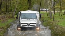 Der Allradantrieb wird über einen dreistufigen Drehschalter aktiviert. Die zweite Stufe bedeutet die Sperrung der Differenziale der Hinterachse, die dritte zusätzlich die der Vorderachse. Gerade die zweite Stufe macht sich gut bei Steigungen, an die unmittelbar eine Kurve anschließt. Was die Kletterkünste des neuen Unimog betrifft, nennt Mercedes folgende Werte: Böschungswinkel: vorne 44 Grad, hinten 51 Grad; Rampenwinkel: 34 Grad; Steigfähigkeit: 45 Grad; Watfähigkeit: maximal 1,20 Meter; Kippwinkel: 38 Grad. Wem das zu theoretisch ist: Der Hochgeländegängige kommt eigentlich immer durch, ob rauf, runter oder drüber, ob vorwärts oder rückwärts. Auch in Euro 6 und trotz Annäherung an die normalen Lkw trägt er seinen Namen also weiterhin völlig zu Recht.