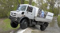 Ob zu Lande, ob zu Wasser – für den hochgeländegängigen Unimog gibt es auch in Euro 6 kaum ein natürliches Hindernis. Scheinbar mühelos meistert er Steigungen selbst bis 110 Prozent, durchquert Wassergräben, überwindet Geröll und pflügt dank neuer Reifendruck-Regelanlage auch durch schlüpfrigen Sand. Nachdem die neuen Geräteträger der Baureihen U 216 bis U 530 bereits ihren Dienst bei Kommunen und Straßenmeistereien angetreten haben, sind nun die hochgeländegängigen Fahrzeuge an der Reihe: U 4023 und U 5023 stehen vor dem Start in den Markt. Zielgruppen sind hier Landwirtschaft, Energieversorger, Feuerwehr, Katastrophenschutz und Militär.