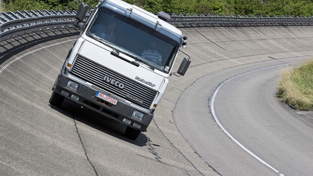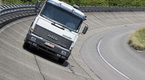 Und trotzdem zieht der Nestor im Lkw-Quartett, der 1986er-Turbostar, die neugierigen Tester als Erster magisch an. Denn unter dem aus heutiger Sicht erstaunlich kompakten Großraumfahrerhaus bollert ein ungeniert gut eingeschenkter V8 sein kultiges Euro-0-Lied. Der Turbostar entführt seine Passagiere in eine Zeit, in der der legendäre Franz Meersdonk in der Kultserie "Auf Achse" am Steuer eines roten 190-42 "Terminfracht in aller Herren Länder" über Stock und Stein steuerte. Kein Handy, ein freundlicher Scheiben-Tachograph und – sagen wir mal – sehr elastische Zeitpläne auf den Fernstrecken bis in den Vorderen Orient verhießen damals Fernfahrer-Freiheit. Die musste man sich freilich mit gewissen Abstrichen am Komfort erkaufen. Aus heutiger Sicht zumindest ist der Turbostar mit einem erfrischend ehrlichen Fahrwerk gesegnet, das den Kontakt zur Straße nie vergessen lässt.