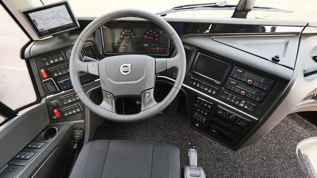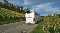 Also sehen wir uns die Unterschiede des 3,65 Meter hohen 9700 zum großen Premiumbruder mit traditionsreichem Theaterboden und flotter Z-Line-Grafik auf der Seite näher an. Das Design ist deutlich einfacher gehalten. Dem Einstiegsmodell fehlt nicht nur die aufregende Seitengrafik, auch der eine oder andere Chromschmuck vor allem im Heck ist nicht an Bord. Der 13-Meter-Zweiachser rollt im Unterschied zum schwereren 9900er (Höhe 3,85 Meter, also genau 20 Zentimeter höher) auf zwei statt auf drei Achsen, und es gibt eine 12,4 Meter lange Kompaktversion mit 380 PS, die sich eher als Doppelverdiener denn als Langläufer anbietet. Außerdem fehlen dem 9700 die praktischen Staufächer des 9900er über den Achsen, die hinten auch durchgehend beladen werden können. Ansonsten verfügen alle Busse über den bekannten D11K-Sechszylinder in Euro-6d-Qualität, der mit 430 oder 460 PS zu Werke geht. Das bedeutet wiederum maximal 2.200 Nm an Drehmoment – das ist zumeist ausreichend. Rekordverdächtig ist es aber nicht, wo doch Hersteller wie DAF oder MAN schon bei Leistungen von 2.600 Nm angekommen sind.