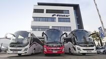 Von 1920 bis 1994 wurden in Heilbronn rund 3.500 Reisebusse gefertigt mit dem charakteristischen, ansteigenden Theaterboden und der unverwechselbaren Pfeilgrafik in der B-Säule. 2005 war dann endgültig Schluss mit der Busproduktion. Den hochwertigen Anspruch – nicht umsonst galten Drögmöller-Busse oft als die "Rolls-Royce des Busbereichs" – reklamiert Hartmann auch heute noch für die Marke Volvo, die 1994 die Heilbronner Edelschmiede übernommen hatte – also noch ein Jahr bevor Daimler sich Setra einverleibte. Heute heißt das auf Neudeutsch "First Choice Premium" und umfasst neben hochwertigen Bussen auch so etwas wie "ausgeprägten Erlebnischarakter" am Ort der Auslieferung. Passend zu diesem Anspruch wurde 2018 die gesamte Reisebusflotte von Volvo erneuert und mit dem 9700er auch Flotten- und Fernbus tauglicher gemacht. Nicht zuletzt der vor Kurzem nachgeschobene, 15 Meter lange Standardbus des 9700 mit bis zu 65 Sitzen und rund 13 Kubikmeter Ladevolumen könnte sich in dem immer größer werdenden Low-Cost-Segment durchaus gut schlagen. Und wo lassen sich Busse besser begutachten und testen als in einem nagelneuen Auslieferungszentrum?