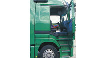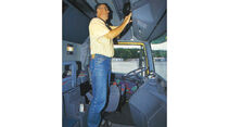 Stichwort Telligent: Das Kunstwort aus "Telematik" und "Intelligent" bezeichnet neben der neuen Schaltautomatik auch das neue Bremssystem mit elektronisch geregelten Scheibenbremsen an allen Achsen – erstmals serienmäßig in einem europäischen Schwer-Lkw. "Bei einer Vollbremsung aus 80 km/h verkürzt sich dadurch der Bremsweg um eine Pkw-Länge", unterstreicht Fronemann. So macht sich der Actros schon vor Einführung von ABA & Co einen Namen in puncto Verkehrssicherheit.