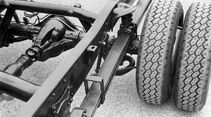 Ein Novum in dieser Fahrzeugkategorie sind Scheibenbremsen, auch wenn sie der T2 nur an der Vorderachse bekommt. Hinten verzögern klassische Duo-Servo-Trommelbremsen.
