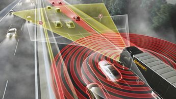 Wie nimmt ein autonom fahrender Lkw seine Umgebung wahr? Die Grafik visualisiert sein "Sichtfeld".