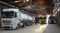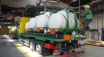 - Etwa die Hälfte des Transportbedarfs erledigt das Unternehmen mit dem Werkverkehr, der 16 Fahrzeuge überwiegend der Marke Mercedes-Benz umfasst. Das Spezial-Equipment – Aufbauten und Wechselsysteme für Tanks – stammen vornehmlich von PL Fahrzeugbau in Schorndorf oder Schrader in Beckum (Tank).