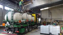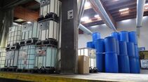 Von der Vielfalt zeugen auch die unterschiedlichen Gebinde, die im Hauptlager von Häffner anzutreffen sind: Fässer, Kanister, Flaschen und jede Menge IBC begegnen dem Besucher dort – wobei der Trend für Logistikleiter Nieß klar zum IBC geht, der deutlich einfacher im Handling sei – für Lkw- ebenso wie für Staplerfahrer. Entsprechend groß sind die Mengen an leeren IBC, die im Eigentum von Häffner sind und sich auf der Freifläche auf dem Firmengelände stapeln.