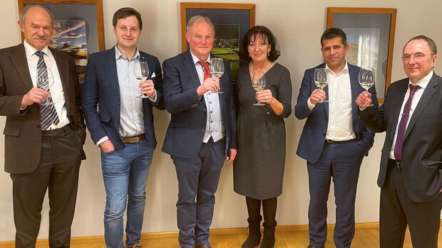Nach der Vertragsunterzeichnung (v. l.): Rechtsanwalt Albrecht Thielen, Steuerberater Daniel Grötz, Geschäftsführer Spedition Gräfen Hans-Josef Gräfen, Ehefrau Jutta Schulte-Gräfen, Geschäftsführer der pfenning-Gruppe Rana Matthias Nag sowie Notar Prof. Dr. Eberhard Kalbfleisch.
