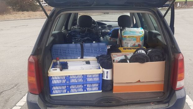 Kofferraum voller Hilfsgüter: An Bord sind Lebensmittel, Hygienebedarf und Reinigungsmittel.