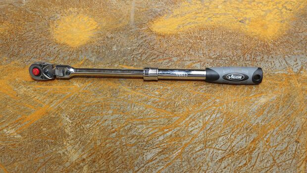 Die Gelenkratsche von Vigor in der Größe 1/2 Zoll bietet eine Teleskopstange, die sich in sechs Stufen verstellen lässt. Ausziehbar ist sie von 350 bis 490 Millimetern und bietet damit maximale Flexibilität und Kraftübertragung. Der Gelenkkopf ist um 180 Grad schwenkbar und lässt sich arretieren. Das Modell hat 72 Zähne, was einem Drehwinkel von fünf Grad entspricht. „Es handelt sich um eine fein verzahnte Ratsche“, sagt Hanselmann. Der Handgriff ermöglicht durch seinen Kunststoffüberzug einen festen und sicheren Halt. Der Links-rechts-Schalter lässt sich leicht mit einem Finger bedienen. Auch bei diesem Modell schützt die Kugelarretierung vor einem Verlust der Steckschlüsseleinsätze, die Fixierung kann über einen Auslöseknopf leicht aufgelöst werden. Das Urteil: „Man kann mit der Ratsche ergonomisch arbeiten. Alles ist ordentlich verarbeitet und hinterlässt bei uns einen soliden Eindruck. Die Ratsche lässt sich flexibel verwenden und ist für viele Einsatzzwecke geeignet.“ Preis (unverbindliche Preisempfehlung): 44,90 Euro (netto).