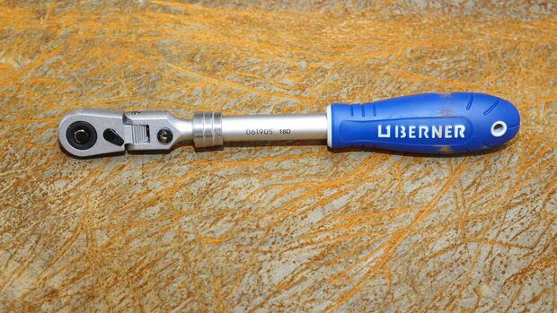 Das Modell von Berner verfügt über eine Teleskopstange, das heißt, der Griff ist ausziehbar beziehungsweise kann in Stufen verlängert werden. Nach jeder Teilverlängerung lässt sich der Griff sicher arretieren. Das Werkzeug kann somit der benötigten Kraft angepasst werden. Je länger der Griff, umso höher ist die potenzielle Kraftübertragung. Der Gelenkkopf ist über 180 Grad schwenkbar und rastet fest ein. Laut ­Berner ermöglicht das, auch extreme Stellen zu erreichen; eine Angabe, die unser Tester Hanselmann bestätigt. Die Links-rechts-Umschaltung lässt sich über einen Hebel mit nur einem Finger bewerkstelligen, auch wenn die Hände schmutzig sind. Eine Kugelarretierung sichert die Steckschlüsseleinsätze vor dem Abrutschen. Gelöst wird die Arretierung über einen Druckknopf. Das Urteil unseres Testers: „Das Werkzeug ist ordentlich verarbeitet und macht einen soliden Eindruck. Der Griff ist ergonomisch und lässt sich sicher handhaben.“ Preis (unverbindliche Preisempfehlung): 86,50 Euro (netto).