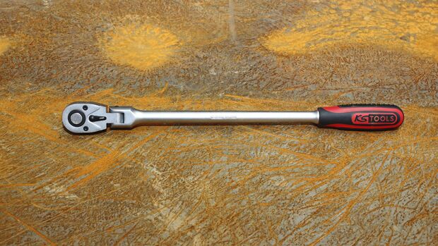Die 1/2-Zoll-Gelenkratsche, die Winkler für den Praxistest bereitgestellt hat, stammt von KS Tools. Ausstattungsmerkmale sind ein um bis zu 180 Grad schwenkbarer Gelenkkopf, der sich nicht arretieren lässt. Er verfügt über eine Kugelsicherung, mit der die Steckschlüsseleinsätze sicher gehalten werden. Per Druckknopf lassen sie sich lösen. Die Länge des Werkzeugs beträgt 440 Millimeter. „Es handelt sich um eine extralange Ausführung, bei der ein Ausziehen nicht möglich, aber wegen der Länge auch nicht nötig ist“, sagt Maik Hanselmann. Das Werkzeug verfügt über 72 Zähne und über eine Feinverzahnung mit einem Winkel von fünf Grad. Die Ratsche besteht aus Chrom-Vanadium-Stahl mit matt satinierter Oberfläche. Es gibt einen Links-rechts-Schalter, der sich leicht bedienen lässt. Das Urteil unseres Testers: „Mit der Gelenkratsche lässt sich gut arbeiten, vor allem dann, wenn man viel Kraft aufbringen muss. Die Ratschenstange liegt gut in der Hand.“ Preis (unverbindliche Preisempfehlung): 62,67 Euro (netto).