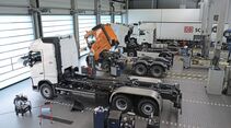 Außerdem achtet Roll auf Ergonomie am Arbeitsplatz, um die körperlichen Belastungen bestmöglich zu verringern. Hinzu kommen wirtschaftliche Anreize. Pflug nennt eine betriebliche Altersvorsorge und eine E-Bike-Mitarbeiterüberlassung. Außerdem unternimmt die Belegschaft gemeinsam einiges wie Fahrradtouren, Grillabende und Bowling. Und als letzten Trumpf: „Im Gegensatz zu vielen Tätigkeiten in der Industrie bieten wir anspruchsvolle, abwechslungsreiche Arbeiten im Nutzfahrzeug-Service“, argumentiert Pflug. Und die sind tatsächlich umfangreich. Der Servicebetrieb bietet nahezu alle Aufgaben rund ums Nutzfahrzeug an – alles, außer Arbeiten an Kältemaschinen. „Das hat wenig mit den Kernkompetenzen eines Nutzfahrzeug-Mechatronikers zu tun. Dafür sind eher Kältetechniker nötig. Darum verzichten wir darauf“, erklärt Pflug. Lackierarbeiten sind an einen Partnerbetrieb ausgelagert. Davon abgesehen, reicht das Angebot von turnusgemäßen Servicearbeiten und Prüfungen über Arbeiten am Tachografen und Toll-Collect-Boxen, Reifenservice, Arbeiten an Glas und Hydraulik (brandneu ist die Partnerschaft mit dem Krananbieter Fassi) bis hin zu Richtarbeiten an Rahmen und Karosserie. Das Ersatzteilelager ist ebenfalls ordentlich bestückt. Dort lagern in drei Etagen Teile im Wert von rund 300.000 Euro. Was nicht vorhanden ist, beschafft Roll im Nachtsprung.Ebenfalls im Aufbau befinden sich spezielle Arbeitsplätze für Gasfahrzeuge. Auch das Know-how für Arbeiten an LNG-Antrieben und Tanks wird ins Unternehmen geholt. Das ergibt Sinn, schließlich setzt gerade Iveco auf diesen alternativen Antrieb.