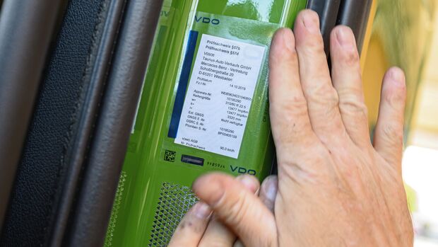 2. Wird die Papierrolle entfernt, muss das Gerät einen Fehler melden – Löffler prüft das, generiert einen Ausdruck und fährt dann mit der Manipulationsprüfung fort. „Das geht heute viel einfacher als noch vor ein paar Jahren. Damals mussten wir noch Kabel legen vom Geber zum Tacho und schauen, ob das gleiche Signal ankommt“, sagt Löffler. Dank Tablet ist das heute in Sekundenschnelle erledigt. Zur Manipulationsprüfung gehört auch der Check des Tachogebers am Getriebe.