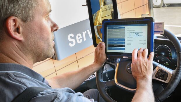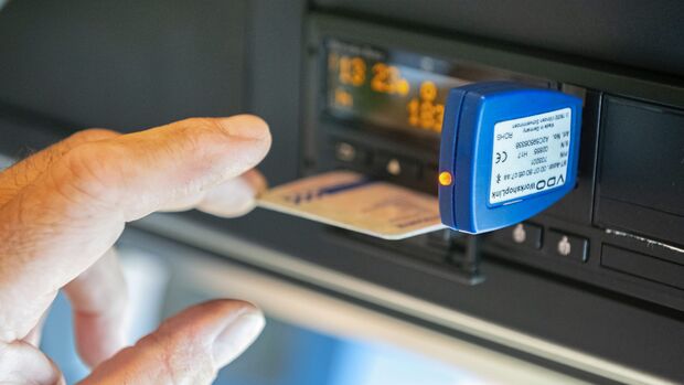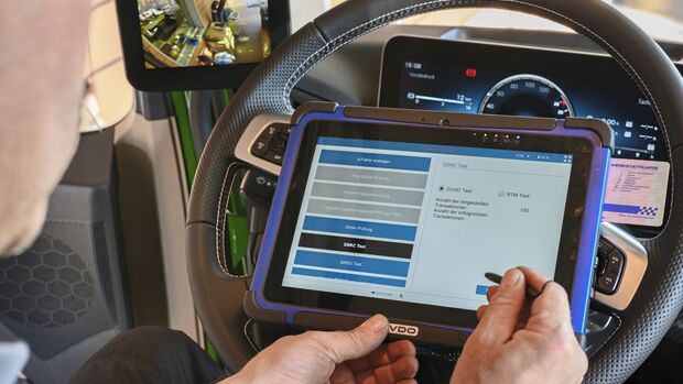 1. Zum Prüfzubehör, das VDO als Set anbietet, gehören unter anderem ein Tablet-Computer und ein Bluetooth-Dongle. Mit diesem stellt der Mechatroniker eine Verbindung zwischen dem Tablet und dem Tachografen her. In einzelnen Schritten führt die Software ihn nun durch das Prüfprogramm. Martin Löffler steckt seine Werkstattkarte in den Tachografen und prüft, ob beide Schächte funktionsfähig sind. Im Rahmen der sonst zweijährigen Prüfung werden die Schächte mithilfe einer speziellen Reinigungskarte, die zum Set gehört, gesäubert. Heute ist das nicht nötig, da der Lkw neu ist.
