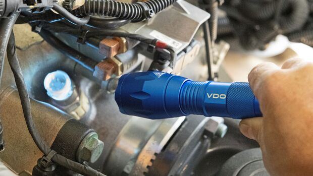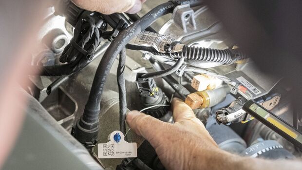 3. Heute hat Martin Löffler großes Glück: Die Zugmaschine ist neu, sauber, ohne Aufbauten oder Getriebeabdeckungen – er kommt relativ leicht heran an den Tachogeber. „Wenn alles verbaut ist, dauert das manchmal deutlich länger, weil man sehr schlecht an den Geber herankommt. Im schlimmsten Fall muss sogar die Kardanwelle raus“, berichtet der Monteur. Dann kann die Prüfung auch nicht pauschal berechnet werden, sondern nach Aufwand. Löffler prüft den Tachogeber: Sind Kabel und Geber unbeschädigt und ist die Plombe intakt? Alles in Ordnung. Jetzt bestrahlt er den Sockel des Gebers mit UV-Licht – leuchtet der Sockel grün, so wie hier, ist alles in Ordnung und das Bauteil nicht manipuliert. Die alte Plombe wird entfernt.